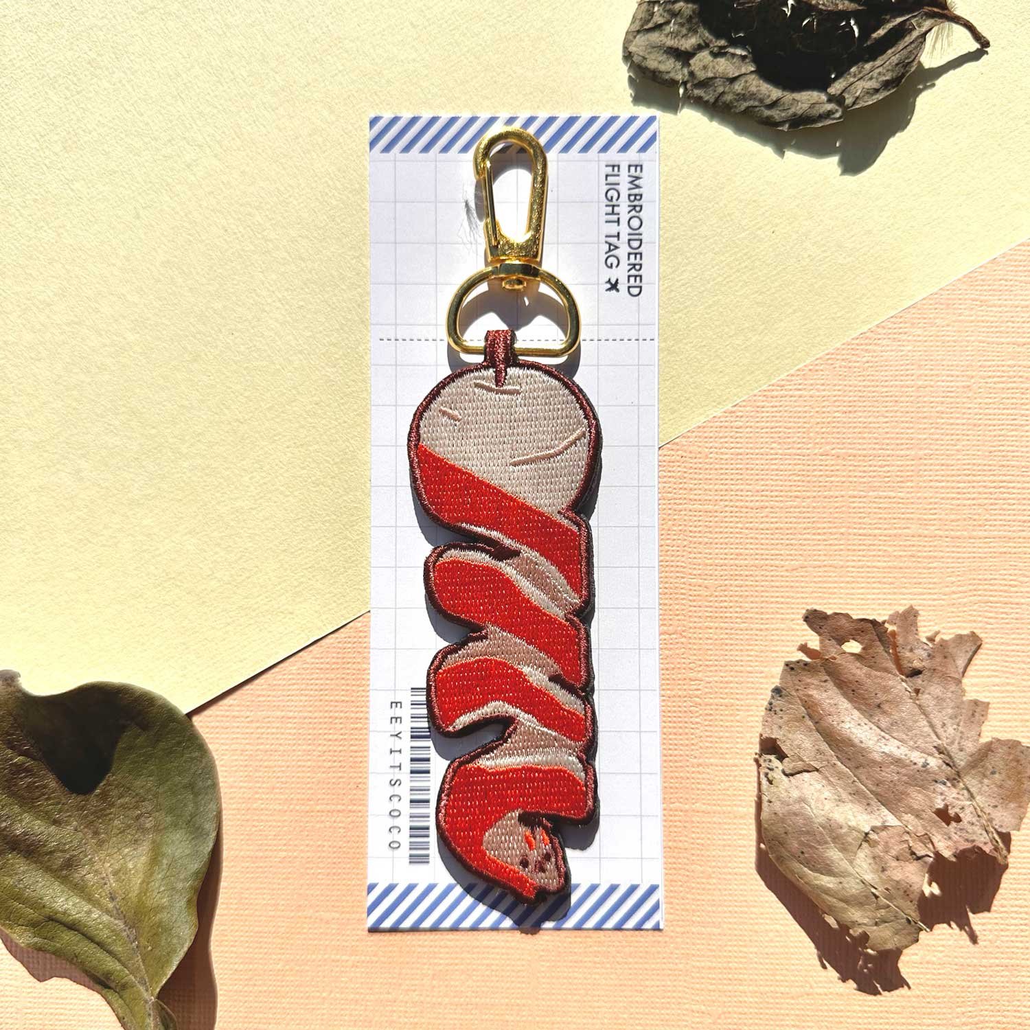 Easily catch sight of your bag with this double sided embroidered apple peel flight tag!