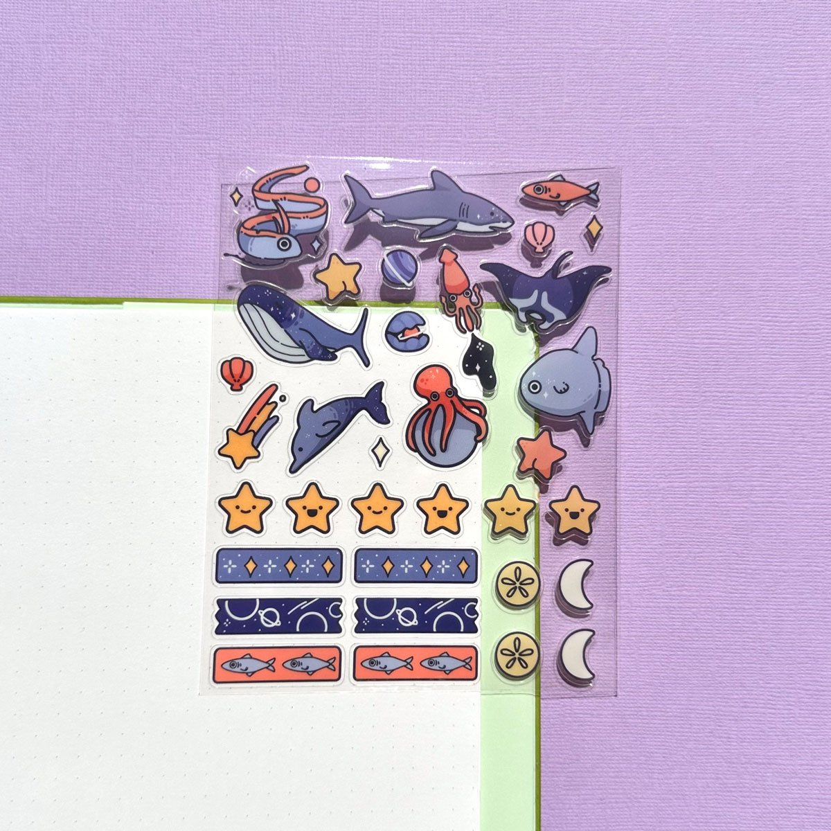 An A6, PET Vinyl sticker sheet featuring spacey sea creatures!